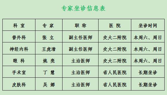 为全面落实对口支援,分级诊疗工作,实现优质资源下沉,让广大人民群众可以在家门口享受到省级大医院的诊疗技术,给广大人民群众提供优质、便捷的医疗服务。我院特邀请西安交通大学第二附属医院、陕西省人民医院普外科、心内科、神经内科、皮肤科等专业知名专家来我院长期坐诊,请广大同仁互相转告,敬请前来就诊咨询!