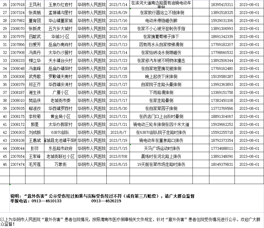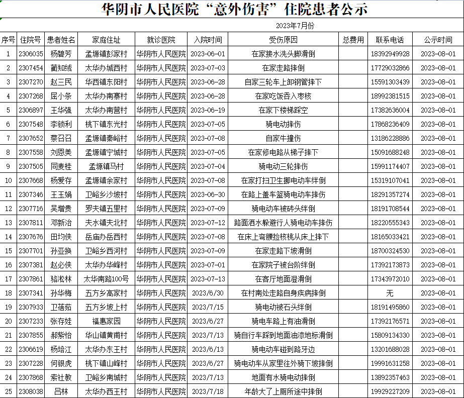 华阴市人民医院“意外伤害”住院患者公示