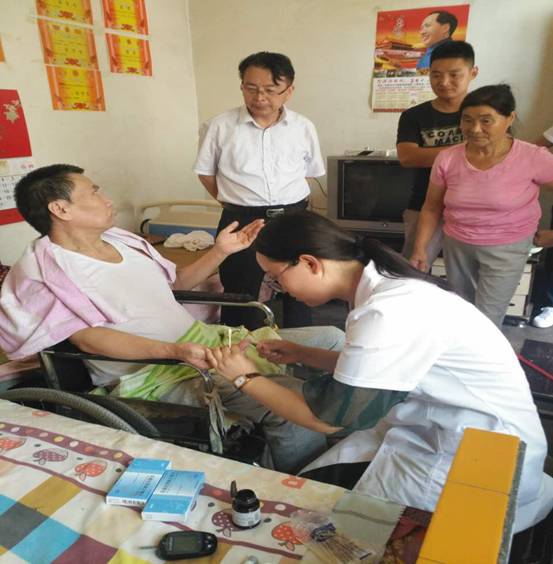孟保华院长的包联贫困户杨卫星长期卧病在床,行动不便,老伴儿也长期患有慢性病,孟院长带领医护人员提着水果上门为杨卫星测血糖、量血压,还针对他的病情,给他发放了家庭常用药品。