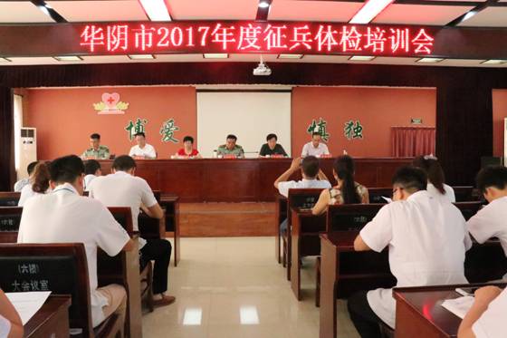 8月12日上午,在华阴市人民医院综合楼六楼召开了华阴市2017年度征兵体检培训会。中共华阴市委常委市武装部部长刘仲卫、市卫计局副局长孙向阳、纪委书记张博琴、市医院院长孟保华、副院长张华平及参与体检的相关临床、护理、医技人员参加了这次培训会。培训会由市人武装部副部长惠鹏波主持。